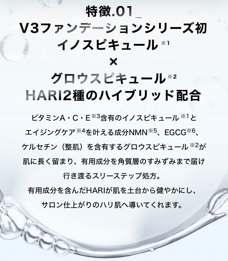 V3ファンデーションシリーズ初、2種類のHARIのハイブリット配合が実現。