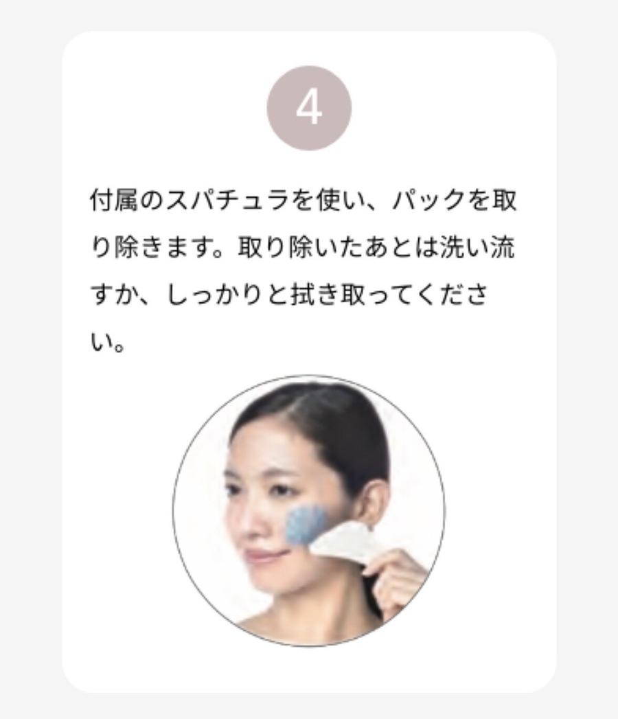 <使用方法>1.洗顔後、水分を拭き取り、お顔全体にご自身の肌の色が見えないくらい厚めに塗布します。2.フェイスラインが気になる方は、耳下線からあご下にも塗布します。3.10分放置します。4.付属のスパチュラを使い、パックを取り除きます。取り除いたあとは洗い流すか、しっかりと拭き取ってください。